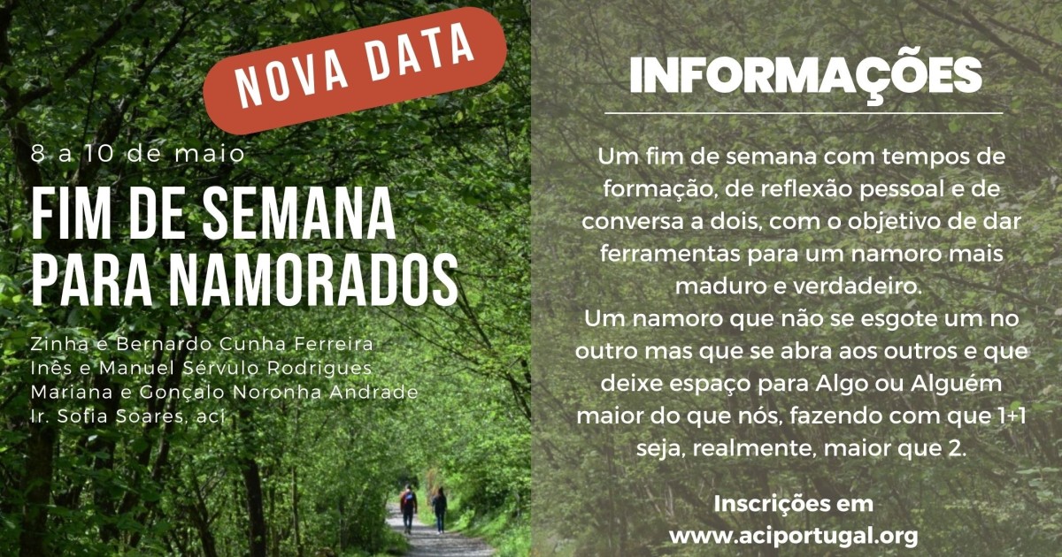 Um fim de semana com tempos de formação, de reflexão pessoal e de conversa a dois, com o objetivo de dar ferramentas para um namoro mais maduro e verdadeiro. Um namoro que não se esgote um no outro mas que se abra a outros e que deixe espaço para Algo ou Alguém maior que nós, fazendo com que 1+1 sema, realmente, maior que 2.